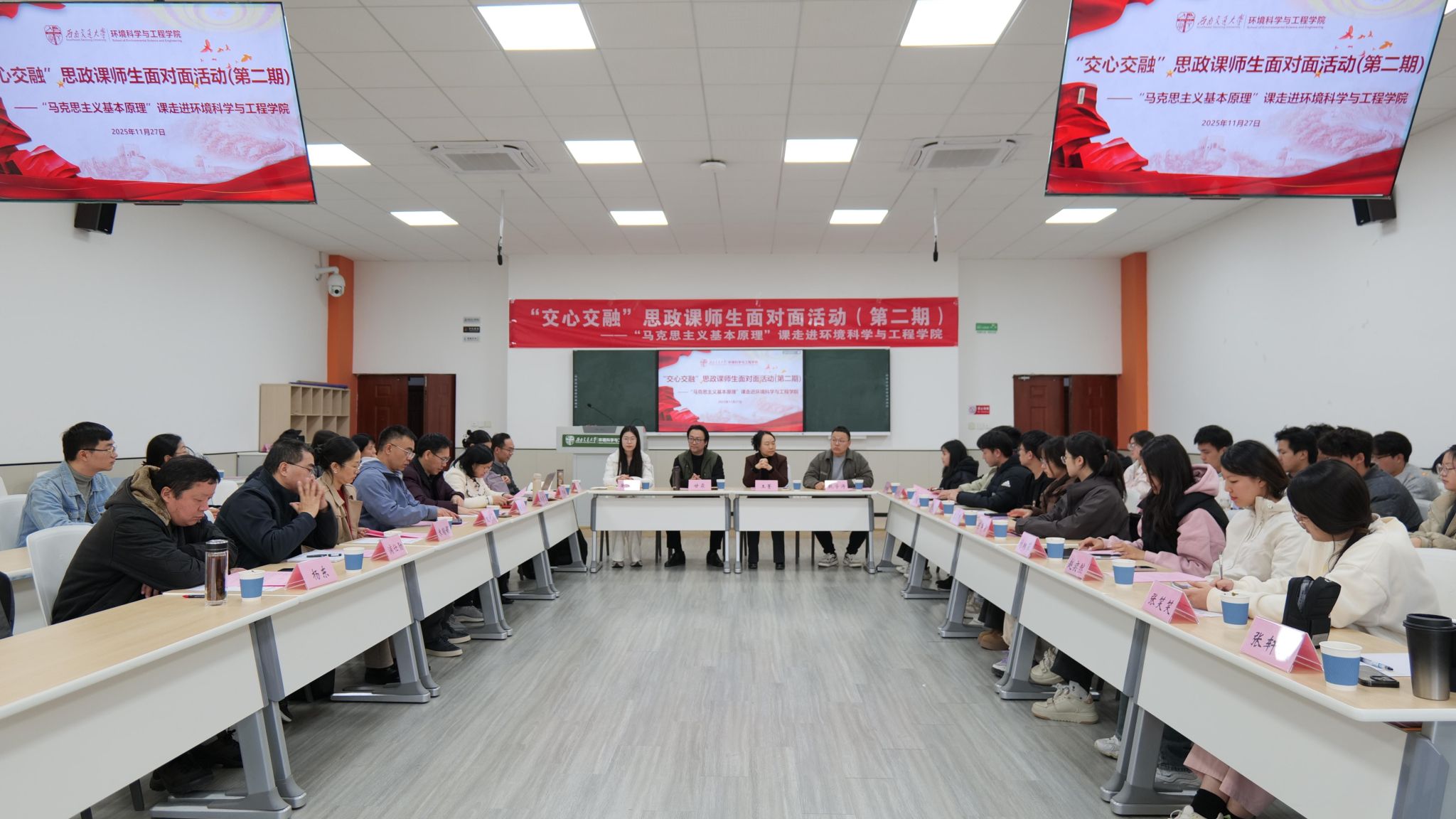 11月27日下午,马克思主义学院联合 木瓜视频 ,成功举办第二期“交心交融”思政课师生面对面活动。双方师生共聚一堂,将马克思主义基本原理课堂从“讲台”延伸至“面对面”,展开了一场有温度、有深度的思想对话。 木瓜视频 党委书记甘霖、马克思主义学院副院长王菁、马克思主义基本原理教研室颜军教授、罗敏副教授等全体教师,以及环境学院辅导员翟琦、赵瑞涵、黄泳桦与2023级、2024级30名学生代表共同参与。活动由马克思主义基本原理教研室党支部副书记甄学涛主持。...