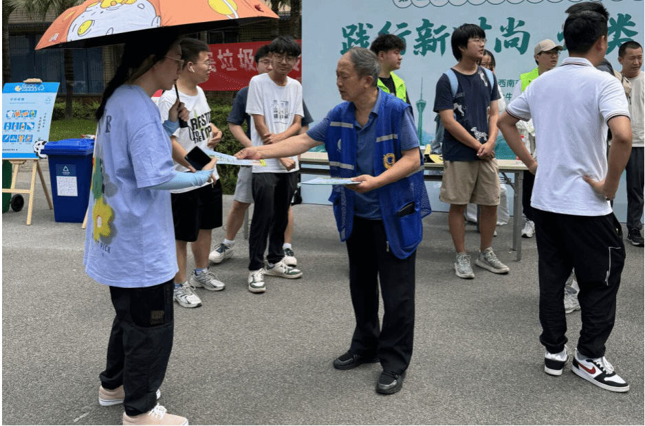 上午10时,在相关负责人的安排下,志愿者们首先将垃圾分类的宣传牌树立起来,以不同的板块为内容依次宣传各类型垃圾的分类方法,同时以对应颜色的垃圾桶为例与往来群众进行互动,展示垃圾桶的用途和标识,让师生直观了解垃圾分类的要求,增进对垃圾分类的理解。