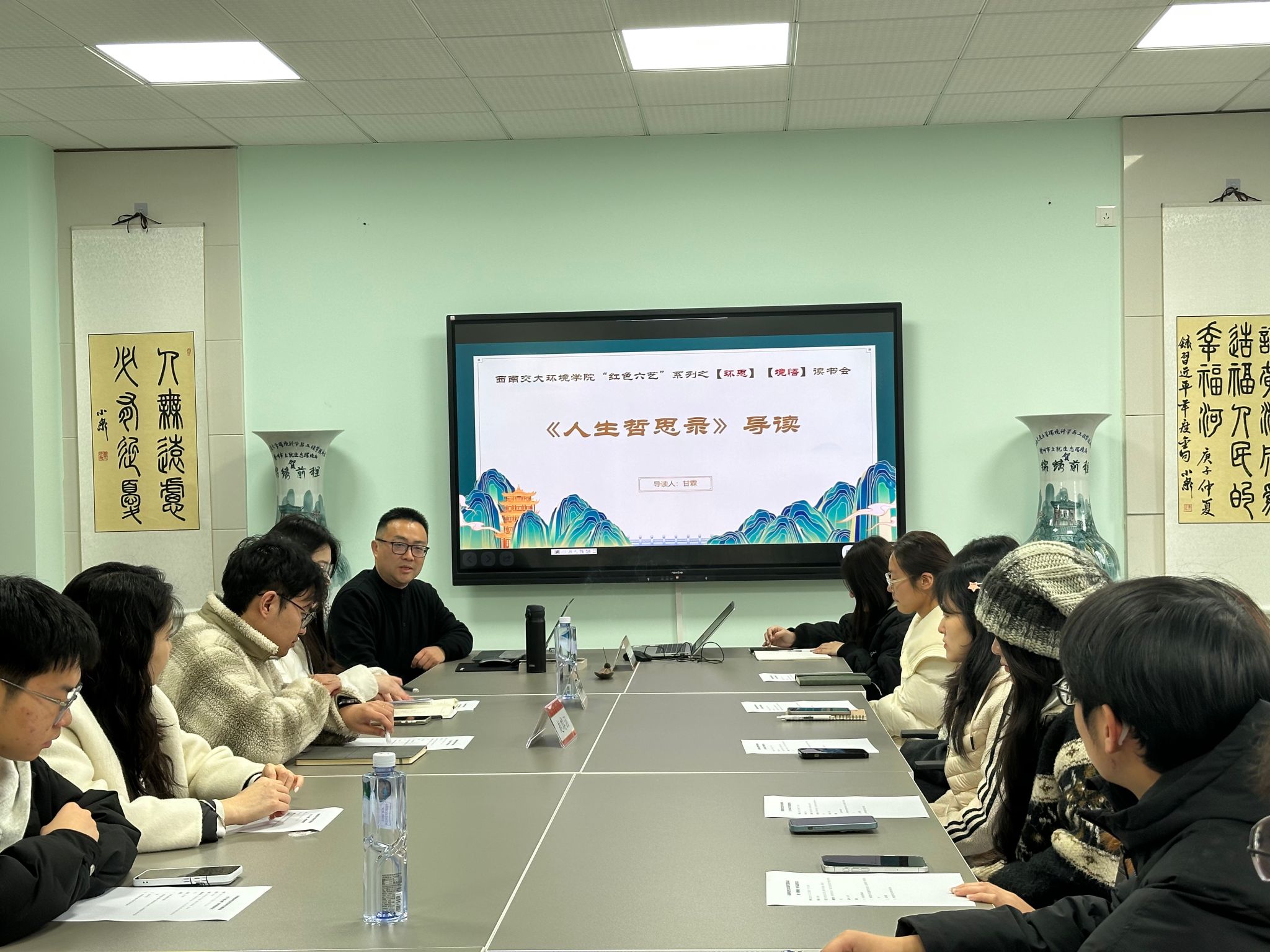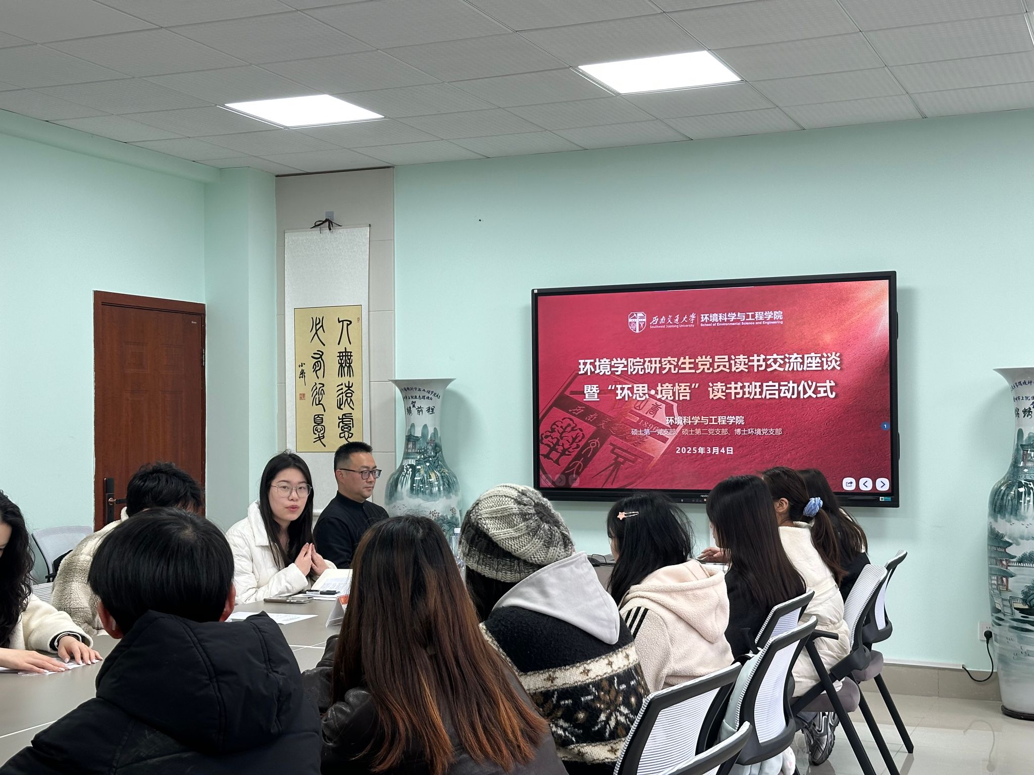 2025年3月4日下午,环境学院于X4348会议室举办环境学院研究生党员读书交流座谈会暨“环思·境悟”读书会启动仪式。学院党委书记甘霖,辅导员赵瑞涵、黄泳桦,以及硕士第一、第二党支部及博士环境党支部学生党员到场参与。读书会由辅导员黄泳桦主持。