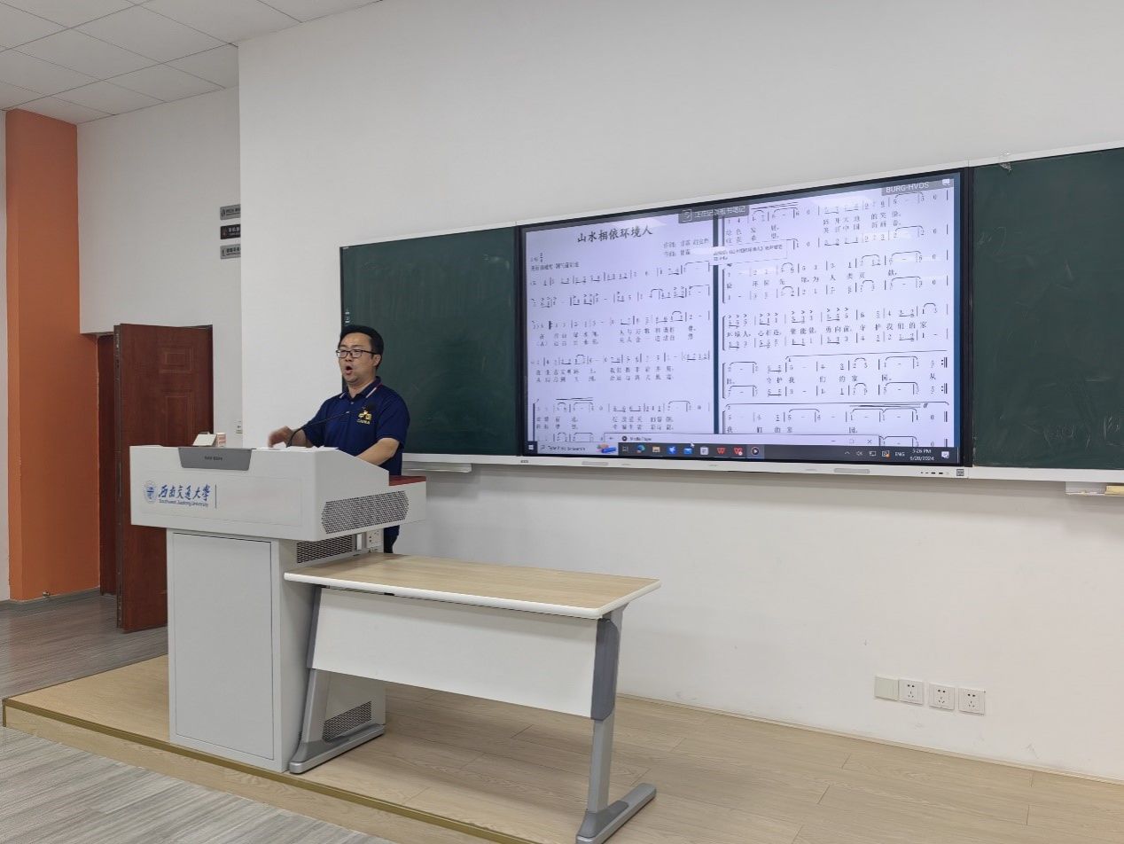第二阶段,学院开展了【艺术思政·文化环境】系列活动。在甘霖书记的带领下,全体参会老师学习了原创的环保歌曲《山水相依环境人》。“在青山绿水间,人与万物和谐相伴。在生态文明路上,我们携手肩并肩......环境人,心相连,聚能量,勇向前,守护我们的家园。”这首歌曲以优美的旋律和深刻的内涵,展现了环境学院师生们对美好环境的向往和追求。通过学习,教职工们进一步坚定了为生态文明建设贡献力量的决心。