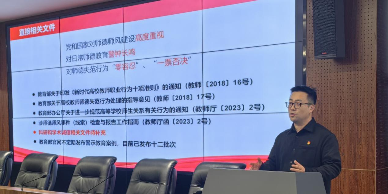 参观结束后,借用展馆会议室,继续开展11月主题党日活动。活动由组织员宋海涛主持。首先,学院党委书记甘霖领学了师德师风与学术诚信主题教育。甘书记强调,国家高度重视师德师风与学术诚信教育,对师德失范行为采取“零容忍”和“一票否决”政策。他结合教育部和学校出台的一系列文件,详细讲解了师德师风与学术诚信的重要性,并列举了一些违反师德师风的典型案例,提醒学院教师们要严格遵守相关规定,守住道德底线,切勿触碰红线,以实际行动践行《新时代高校教师职业行为十项准则》,无愧于人民教师的称号。