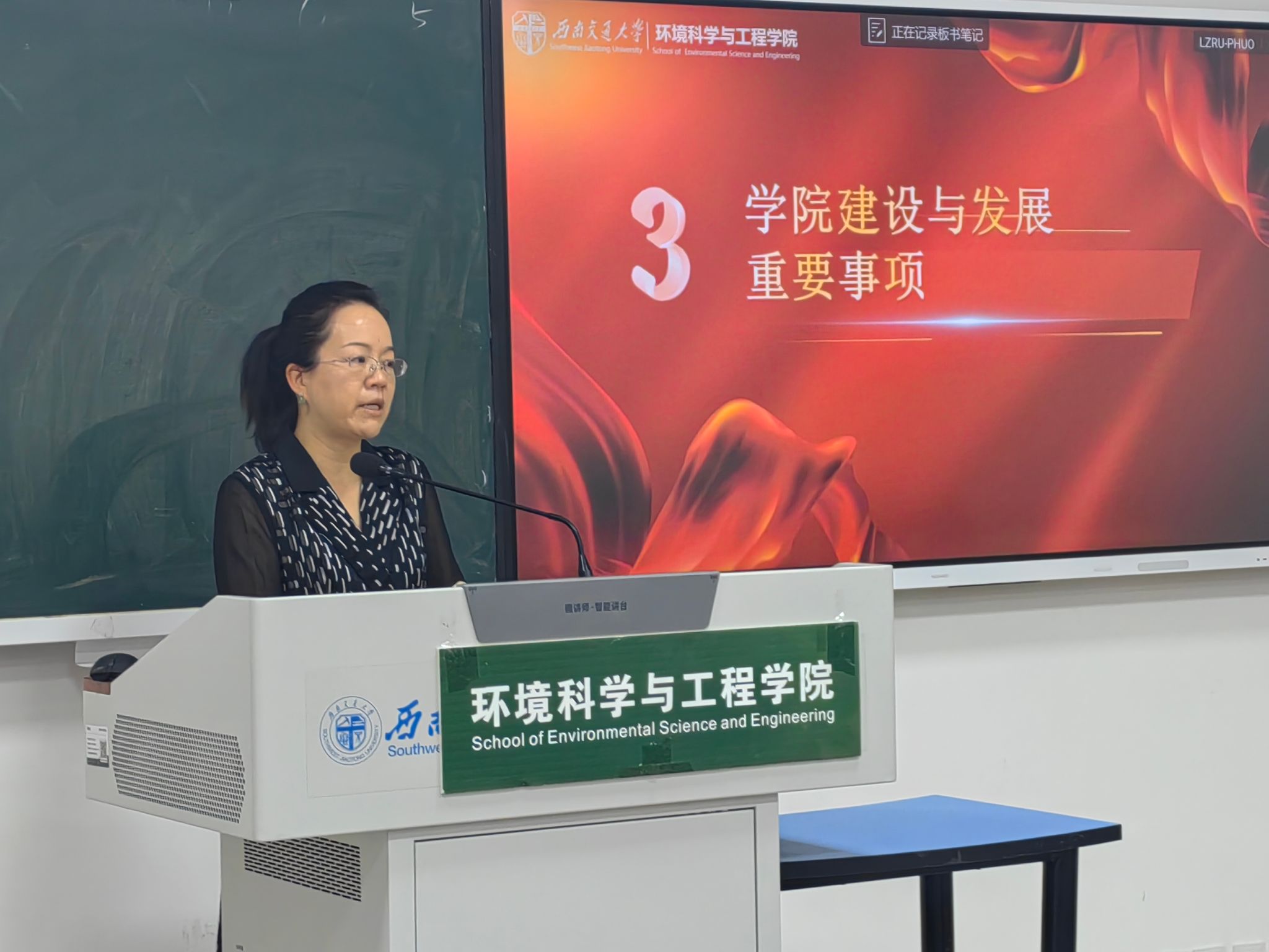紧接着全院大会,执行院长龚正君就学院建设与发展重要事项作了详细报告。龚院长首先通报了学院申报本科新专业的相关工作情况,她指出,申报新专业是学院发展的重要举措之一,也是提升学院办学实力、扩大学科影响,满足新时代对环保人才需求的重要途径。她鼓励全院教职工要积极参与新专业的申报和建设工作,为学院的高质量发展贡献自己的力量。同时,龚院长还提出了完善学院二级机构的构想,她表示,完善二级机构是学院管理体制改革的重要一步,有利于优化学院组织架构,明确各机构的职责和权限,提高学院的管理效率。她还强调,学院刚成立不久,在各方面配套还不完善的时期,我们每位教职工都要在努力完成好本职工作的基础上,更加主动作为、积极建言,自觉补位,对学院的高质量发展深入思考与谋划,促进学院各项工作有序有力地开展。