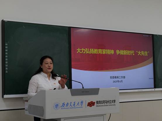 会议第一部分,学院邀请化学学院党委副书记张春燕作题为《大力弘扬教育家精神 争做新时代“大先生”》的专题报告。报告从“追求师德‘高线’”“守住师德‘标线’”“远离师德‘红线’”三个维度展开,系统阐释了新时代高校教师的职业使命与行为准则。