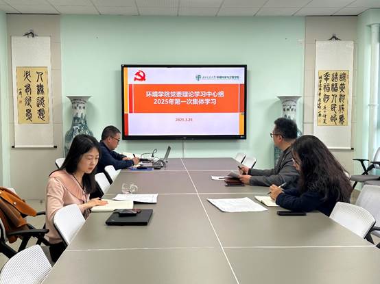 2025年3月25日下午,环境学院党委理论学习中心组在学院会议室举行2025年第一次集体学习,专题学习贯彻2025年全国两会精神。本次学习由学院党委书记甘霖主持并领学,院长龚正君、副院长张涵等中心组成员参加学习并作交流发言。