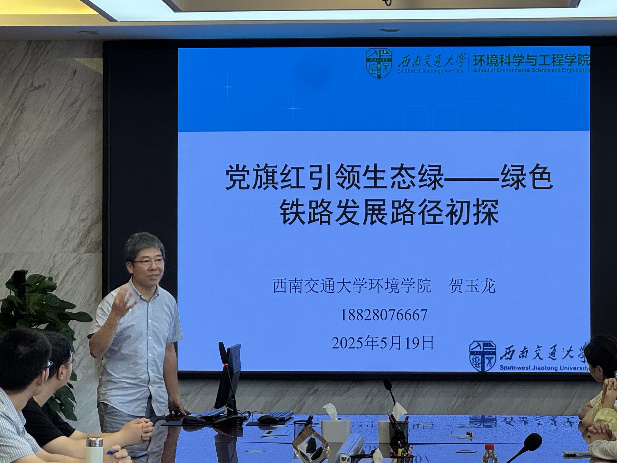 活动伊始,环境学院贺玉龙教授带来“党旗红引领生态绿——绿色铁路发展路径初探”的分享。贺教授详细阐释了“绿色铁路”“绿色设计”“绿色施工”“绿色铁路评价”等关键内容,以环境价值为尺度,强调运用绿色技术,在保障铁路运输安全高效的同时,降低对生态环境负面影响,推动铁路可持续发展,为与会人员打开了绿色铁路发展研究的新视野。