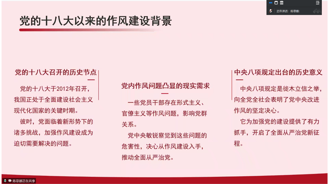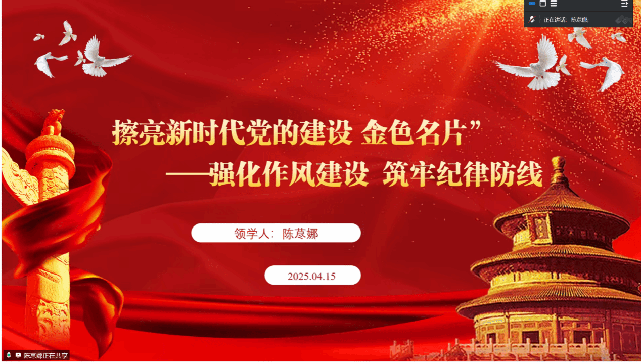 首先,陈荩娜同志以“擦亮新时代党的建设‘金色名片”为主题展开领学,向支部成员强调了党的十八大以来,以习近平同志为核心的党中央以制定出台中央八项规定开局破题,坚持自上而下、以上率下,刹住了一些长期没有刹住的歪风,纠治了一些多年未除的顽瘴痼疾,解决了新形势下作风建设抓什么、怎么抓等重大问题。