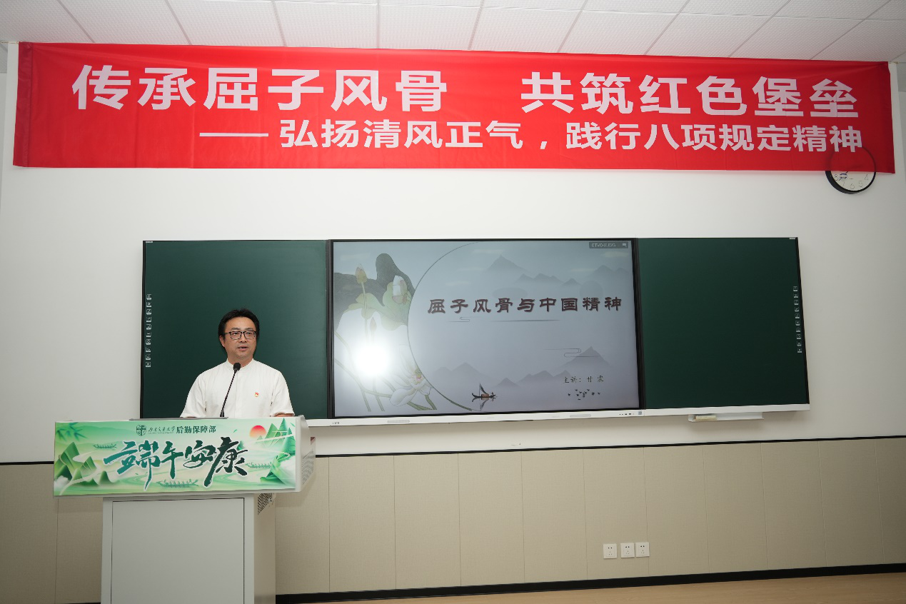 随后,环境学院党委书记甘霖以《屈子风骨与中国精神》为题讲授微党课。他以屈原生平与《楚辞·橘颂》创作为脉络,结合新时代国家发展成就,解读中国精神的丰富内涵,阐释了屈原作品中“深固难徙,廓而无求兮”的坚守初心、“闭心自慎,终不失过兮”的自律品格、“淑离不淫,梗其有理兮”的刚正气节,以及“行比伯夷,置以为像兮”的廉洁风范。