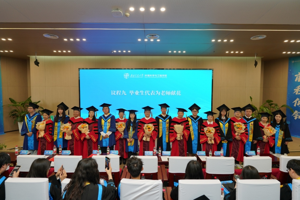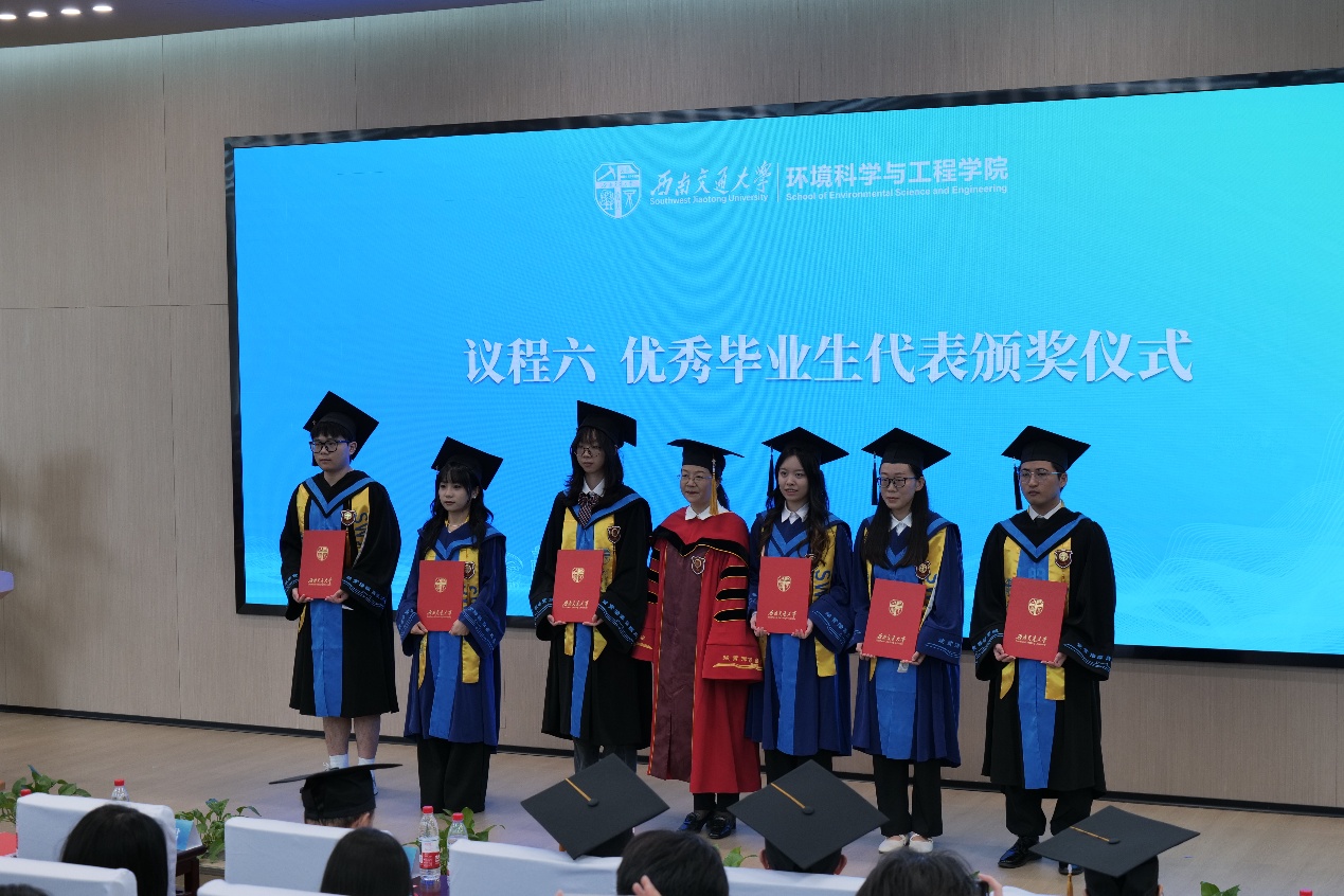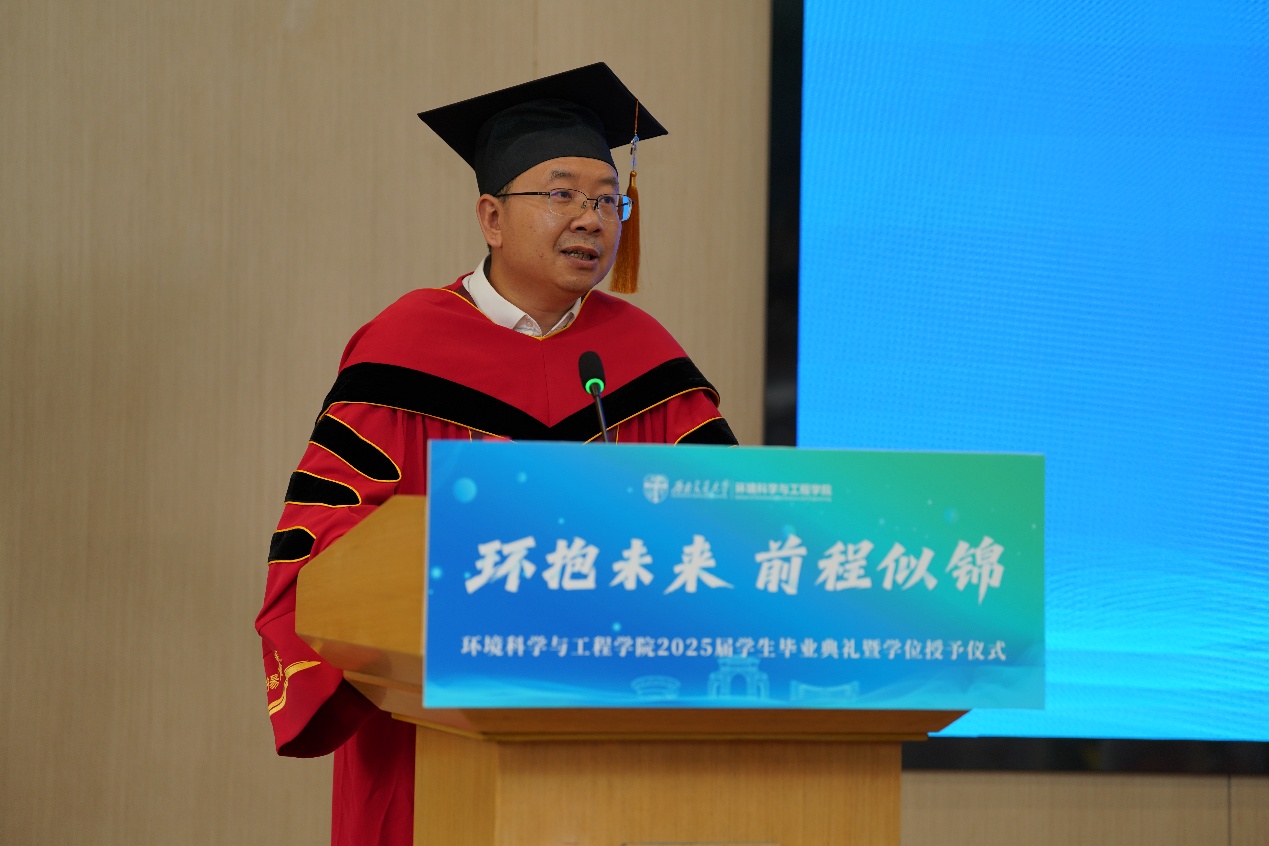 2025届学生毕业典礼暨学位授予仪式在犀浦校区图书馆二号报告厅举行。环境学院党委书记甘霖,院长、学院学术学位评定委员会主席龚正君教授,学术学位评定委员会委员欧阳峰教授,副院长、学术学位评定委员会委员张涵教授,专项工作主管、学术学位评定委员会委员范美坤教授,专项工作主管王东梅教授,工会主席彭道平副教授,校友工作办公室主任刘颖副教授,对外交流与培训中心主任张胜利副教授,学院辅导员,以及2025届全体学生、学生家长参加典礼。典礼由环境学院党委副书记、纪委书记胡安辉主持。