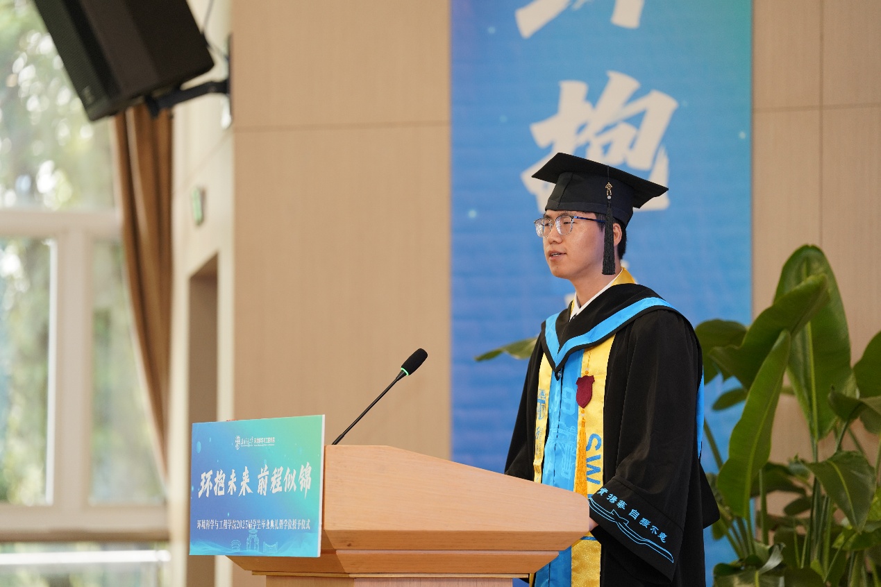 2021级本科生、竢实扬华奖章获得者杨涛作为毕业本科生代表发言。他首先感谢了母校和学院各位老师的辛勤栽培,并回望四年间课堂求知的凝神专注、专业实验的技能淬炼、与同窗并肩的成长轨迹。他呼吁全体毕业生携“竢实扬华,自强不息”的交大精神,在深造科研或服务社会的不同路径上,以“美丽中国奋斗有我”的信念浇灌青春理想,让交大环境人的担当在绿色发展征程中绽放光芒。