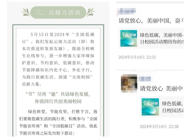 充分依托“环境有道”微信公众平台,发起“‘节’尽所‘能’共话绿色发展,你我同行共创美丽校园”倡议书,从“绿色出行”“节约用纸”“节约用电”“节约用水”“节约粮食”等多个维度发出倡议,学校师生在充分阅读倡议书的基础上转发了倡议书,以带动更多的身边人践行“绿色低碳”理念,为美丽中国云接力。