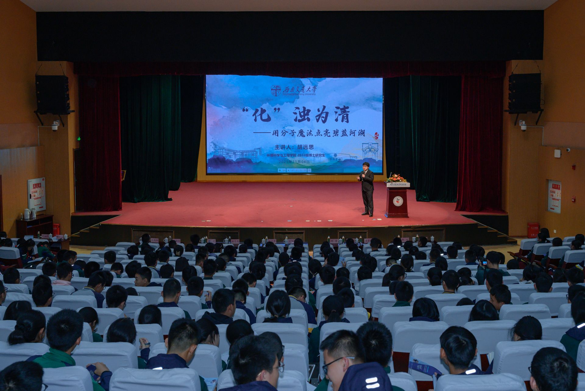 胡远思博士作了题为《“化”浊为清:用分子魔法点亮碧蓝河湖》的首场讲座,用浅显易懂的语言,深入浅出地阐释了化学课本中的反应方程式如何助力河湖污染治理,引导同学们感受知识服务“美丽中国”建设的现实意义。