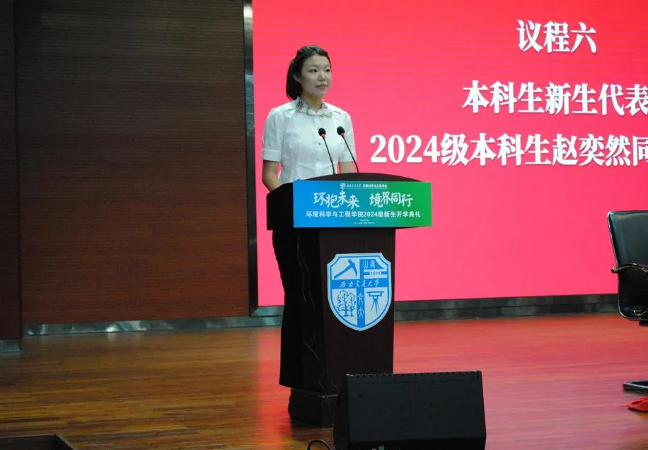 赵奕然作为本科生代表发言,表达了对加入学院的激动、对环境专业的热爱、对大学生活的期待和对未来的憧憬。她代表全体2024级本科新生庄严承诺,将珍惜在交大的学习机会,追求卓越,为推进人与自然和谐共生的现代化建设贡献青春力量。