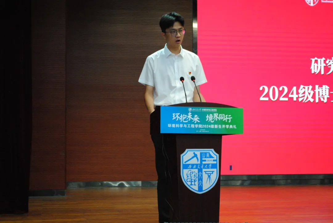 2024级博士生任兴念作为研究生代表发言,表达了对新学术旅程的期待,并承诺将深入研究,积极贡献于环境领域。强调了团队合作的重要性,并鼓励同学们勇于探索,追求卓越。