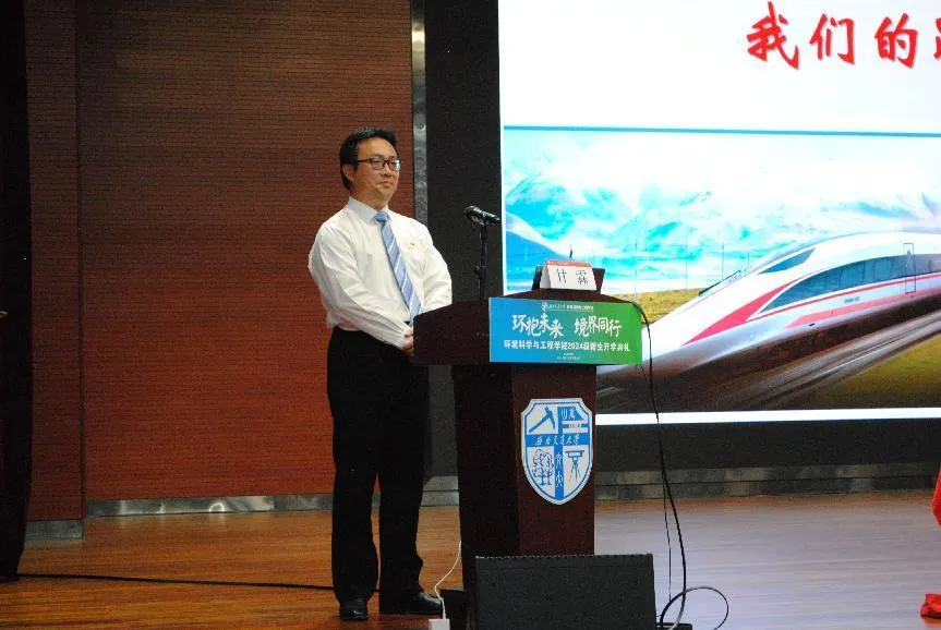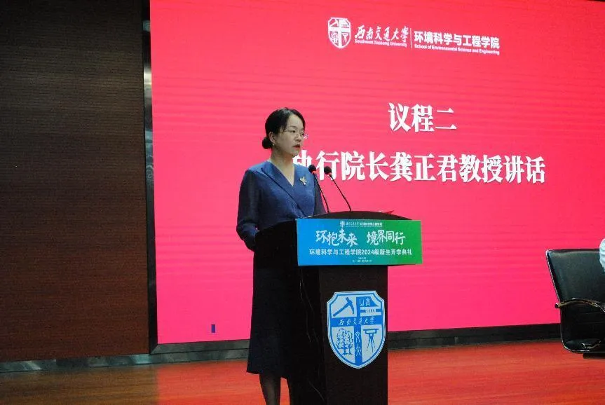 龚正君代表学院党政领导班子、全院师生对2024级新生表示了热烈的欢迎,她寄语新环境人要热爱祖国、热爱专业、热爱团队和自己,希望同学们以家国情怀去担当青年使命,为中华民族的伟大复兴付出行动和努力,以小我成就大我!以国家发展为己任,积极投身生态文明建设,成为推动绿色发展的未来栋梁!院长的讲话激励了在场师生,共同为实现中华民族永续发展的目标而努力。