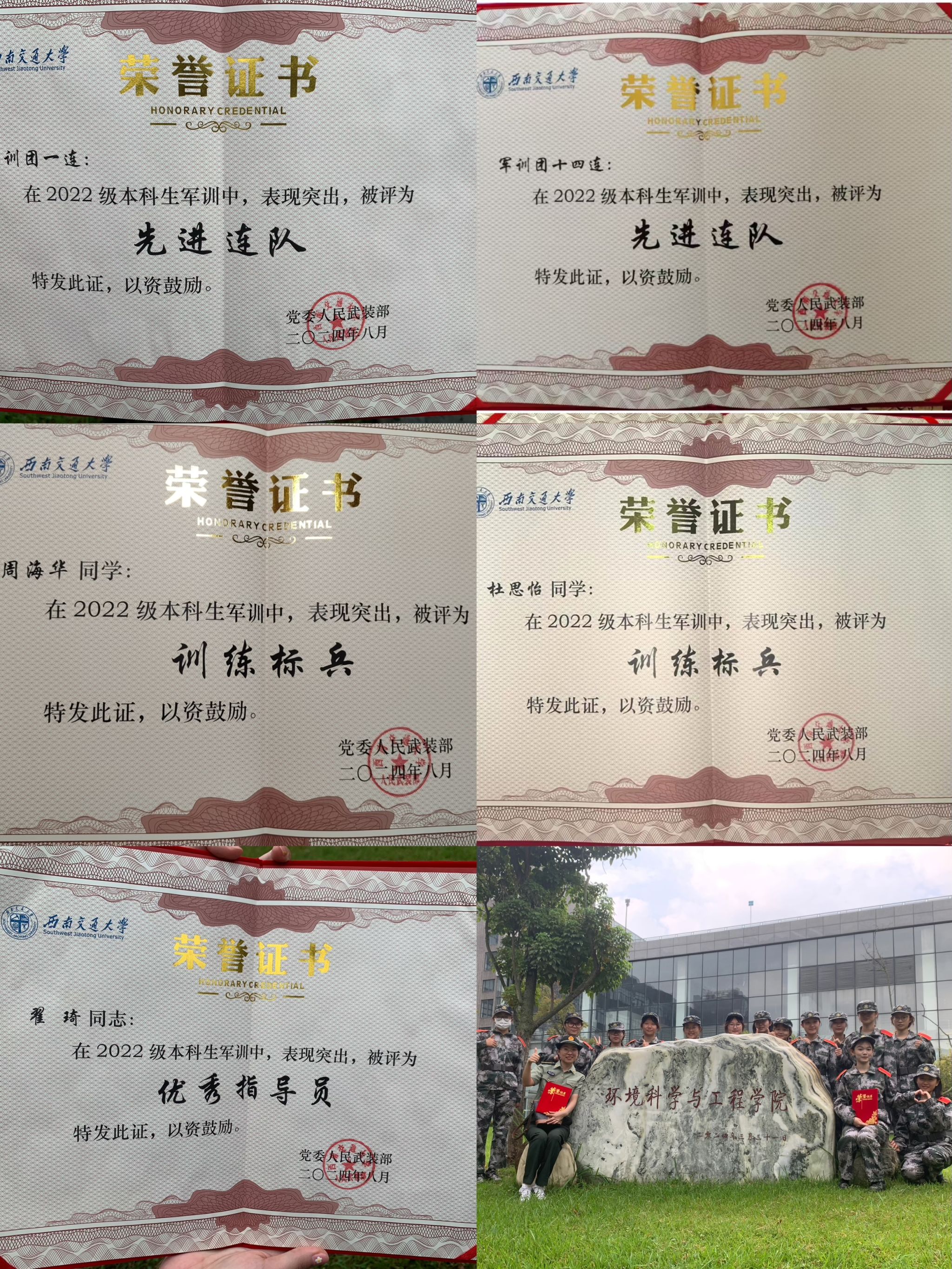 军训结束后,环境学院女生所编入的一连队和男生所编入的十四连队均评为优秀连队,环境学子杜思怡同学、周海华同学均评为训练标兵,一连队指导员翟琦评为优秀指导员。