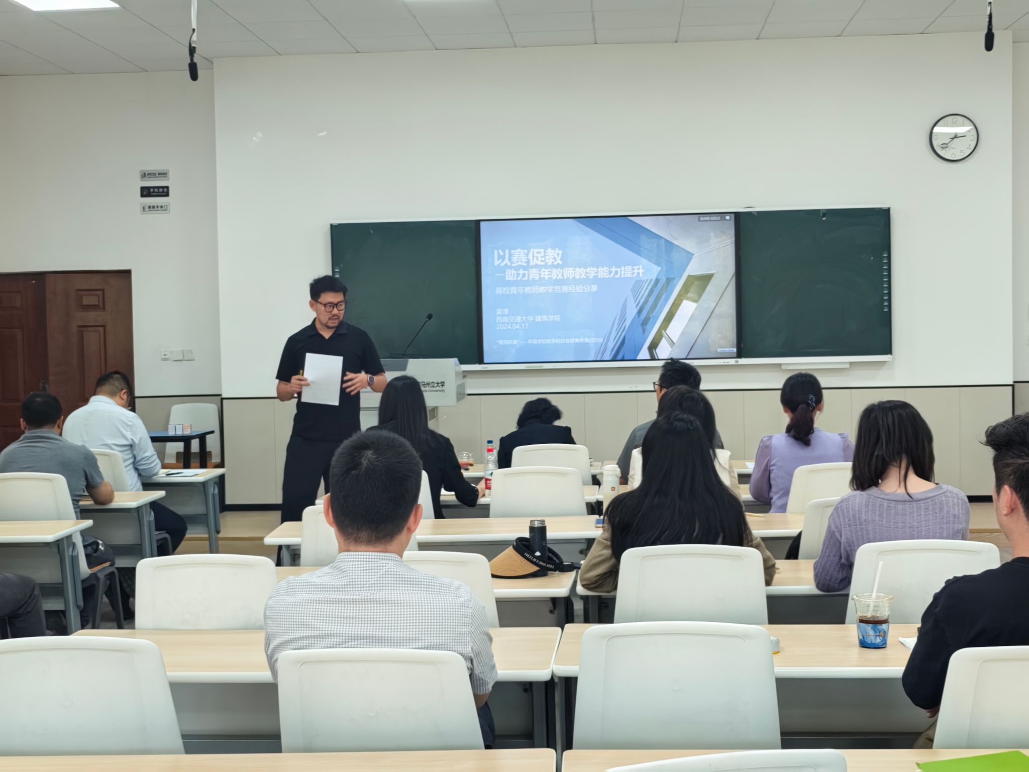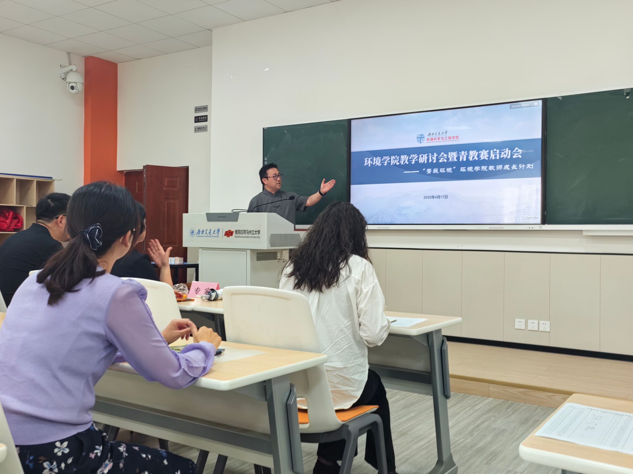 2025年4月17日下午,环境学院在X4247会议室隆重举行教学研讨会暨青年教师教学竞赛启动会。会议由甘霖书记致欢迎辞、赵锐副院长主持,聚焦“深化教学改革、提升育人质量”主题,特邀四川省“四有”好老师,外国语学院党委书记李成坚教授、全国青教赛一等奖获得者,建筑学院宣湟副教授作专题分享,全院教职工集体参加学习。