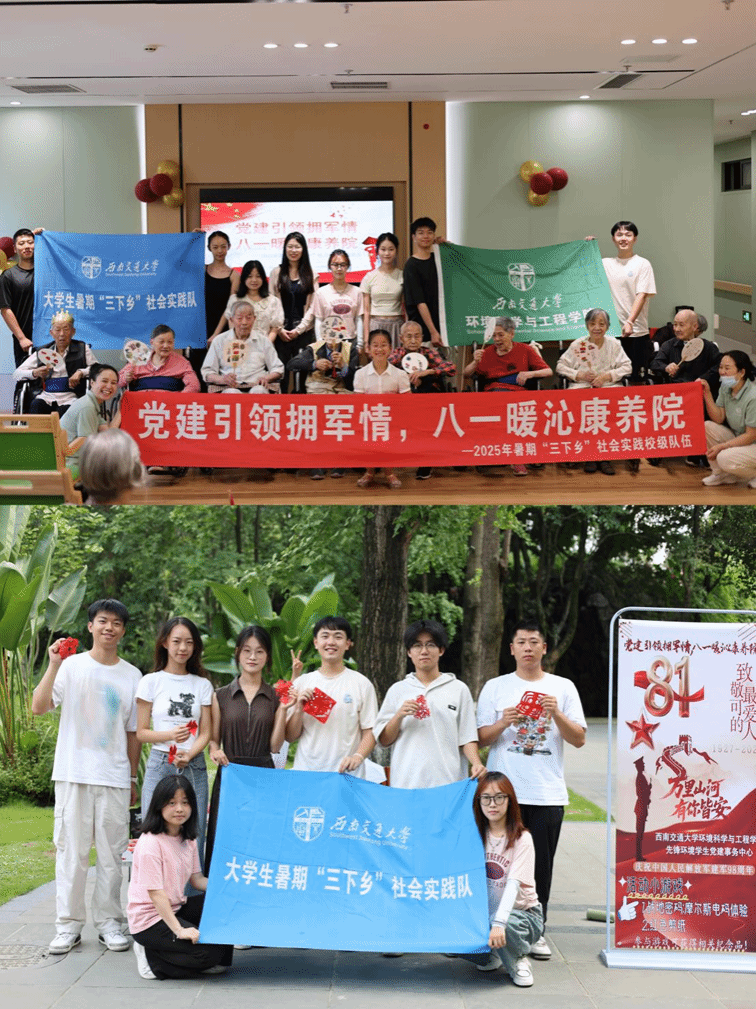 环境学院学生党建中心成员于7月27—28日在成都市青羊区文化公园、成华区鸣恩康养中心开展“党建引领拥军情·八一暖沁康养院”暑期“三下乡”社会实践活动。活动以弘扬爱国拥军传统为主线,融合学院环境学科特色,把课堂搬到公园与康养一线,为老军人送关爱、为绿色发展献青春,打造一堂行走的爱国思政课。