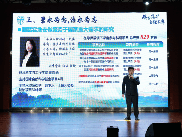 接着,胡远思分享了自己跨考环境后的奋进故事,他从环境专业的门外汉一步步成为环境领域人才,理论与实践并行,投稿多篇顶刊、出版几部著作,完成了四川省小流域监测治理99.5%到100%的进步。他鼓励大家服务于国家重大需求,将小我融入大我,真正做到个人发展与国家战略相结合,将论文写在祖国大地上。