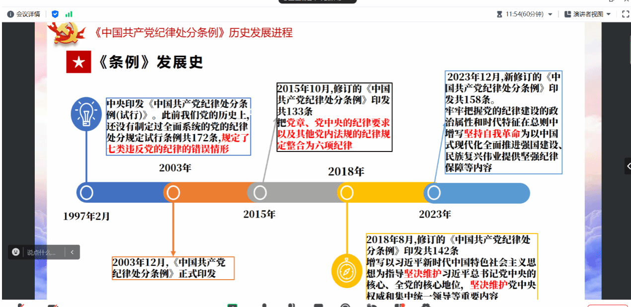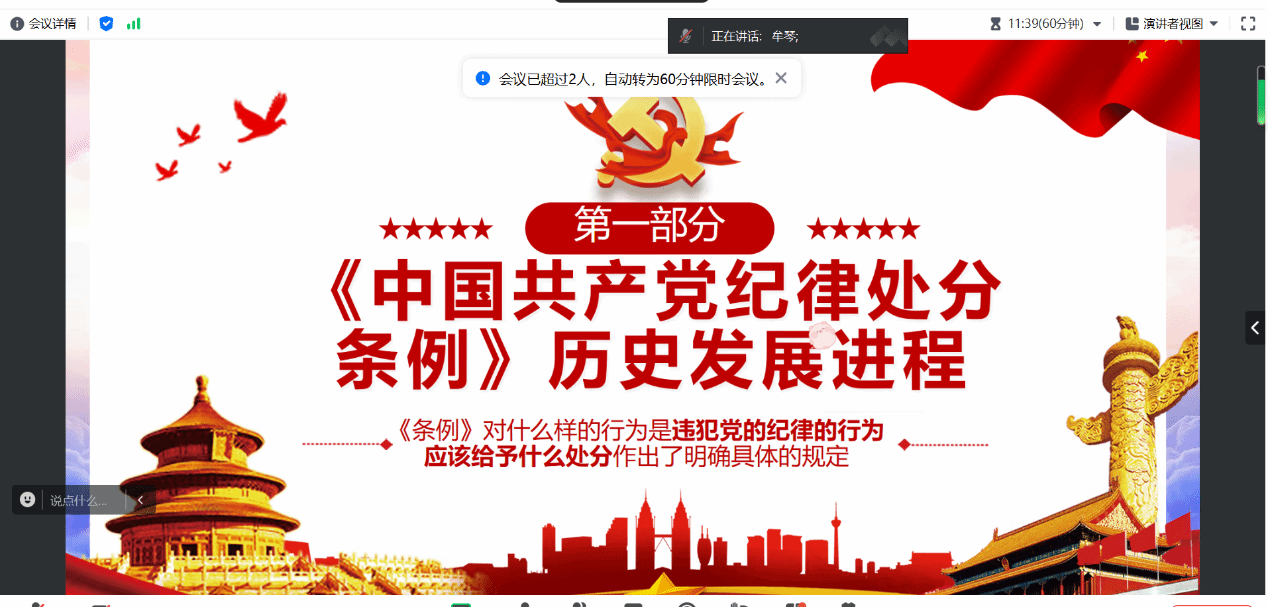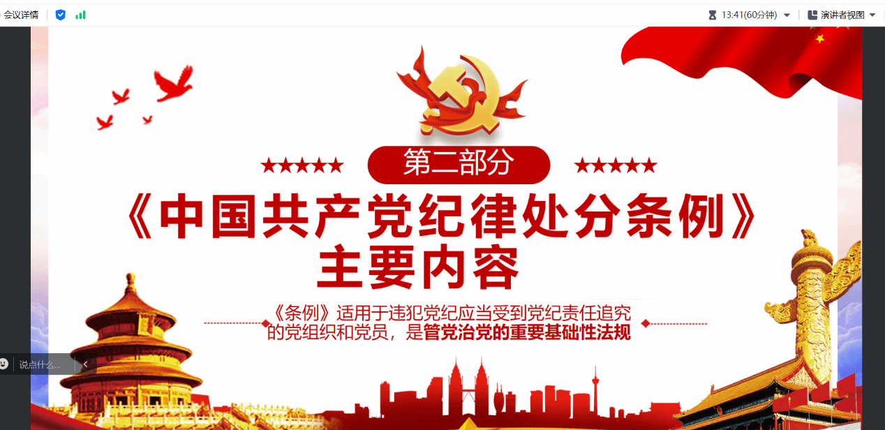 此次党日活动积极动员支部成员领学,由支部成员提前预习相应的理论知识,在党日活动上以PPT汇报的形式带领支部成员共同学习。本次领学的支部成员为牟琴同志。牟琴同志带领大家学习《中国共产党纪律处分条例》的发展进程和主要内容。该条例是关于党的纪律和纪律处分方面的一部重要党内法规,是规范所有党组织和党员行为的基础性法规;该纪律处分条例是根据《中国共产党章程》制定的。