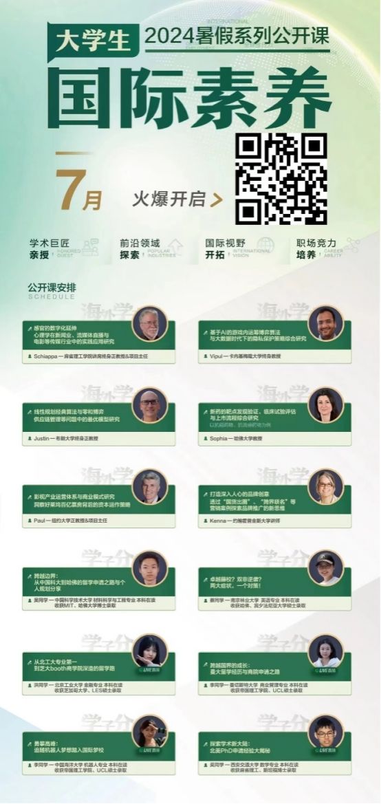 本次素养课程我们邀请到麻省理工学院、卡内基梅隆大学、布朗大学国际知名高校教授分享,培养学生科研视野和学术能力,了解国内外教学模式差异,完善学生在学科认知领域的知识结构,学习 AI 算法等交叉学科领域的知识与研究方法。