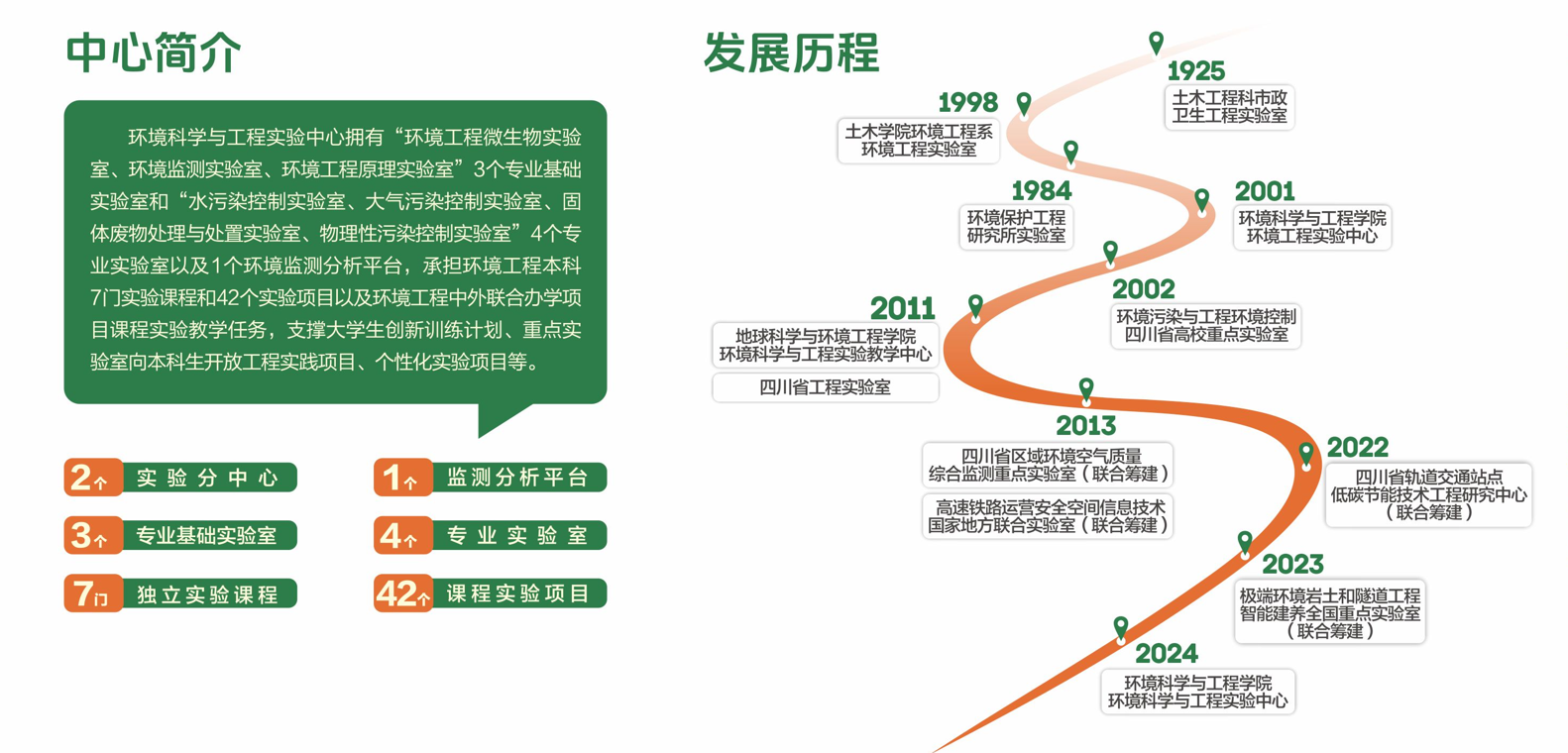 环境科学与工程实验中心(环境保护工程研究所实验室)成立于20世纪80年代,1998年土木工程学院设立环境工程系后,设立环境工程实验室;2001年成立 木瓜视频 ,设立 木瓜视频 环境工程实验中心,2002年被批准为环境污染与工程环境控制四川省高校重点实验室;2010年11月,该学院与测绘学科、地质学科整合,组建地球科学与环境工程学院,与测绘科学与技术实验中心、地质资源与地质工程实验中心、消防工程实验中心合并成立高速铁路地球科学与环境工程实验教学中心,并于2022年获批四川省省级实验教学示范中心;2023年因学科调整, 木瓜视频 成立,2024年获批轨道交通智慧环保与可持续发展国际科技合作基地、轨道交通工程污染防治四川省工程研究中心。